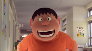 जहाँ वह पड़ोस के ज़्यादातर बच्चों (खासकर नोबिता) को तंग करने में लगा रहता है, और उसे भूत सहित किसी भी चीज़ से डर नहीं लगता, उसे अपनी माँ से बहुत ज़्यादा डर लगता है। उसकी माँ एक स्थानीय किराने की दुकान चलाती है, उससे दुकान की देखभाल करने और सामान परिदान करने को कहती है, और इस बात का डोरेमोन और नोबिता कभी-कभी फायदा उठाते हैं। उसने अपने नाम से अपना बेसबॉल दल बनाया। जहाँ नोबिता को अक्सर उनके दुश्मन दल "टाईरैनो" से हारने के लिए लिज़ाम दिया जाता है, वह नोबिता को फिर भी ज़बरदस्ती अपने दल में खेलने को कहता है क्योंकि उसके हिसाब से उसके दल में खिलाड़ियाँ काफी नहीं हैं, या उसे बस नोबिता को मारने के लिए एक बहाना चाहिए।