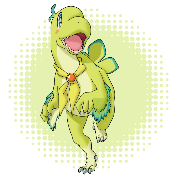 คิวเป็นไดโนเสาร์พันธุ์แร็พเตอร์ตัวสีเขียว มีนิสัยขี้กลัว และอ่อนแอต่างจากมิว