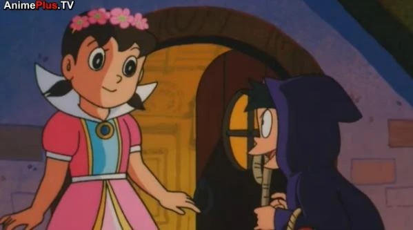 The scene then switches to another forest with Suneo dresses as a witch, carrying a basket of poisonous apples toward a small cottage. Witch Suneo then knocks the cottage's door and Snow White Shizuka soon comes out. The witch then offers Shizuka an apple, telling her that this is a magical apple that will make her dream come true. Believing in the witch's words, Shizuka wishes to live happily ever after with a prince and bites the apple, causing her to immediately fall on the floor. Witch Suneo sadistically laughs and tells her to sleep "until the end of this world" before makes an escape.