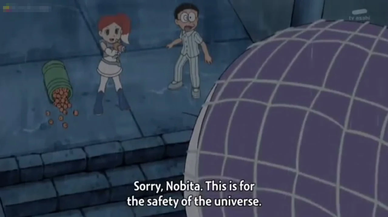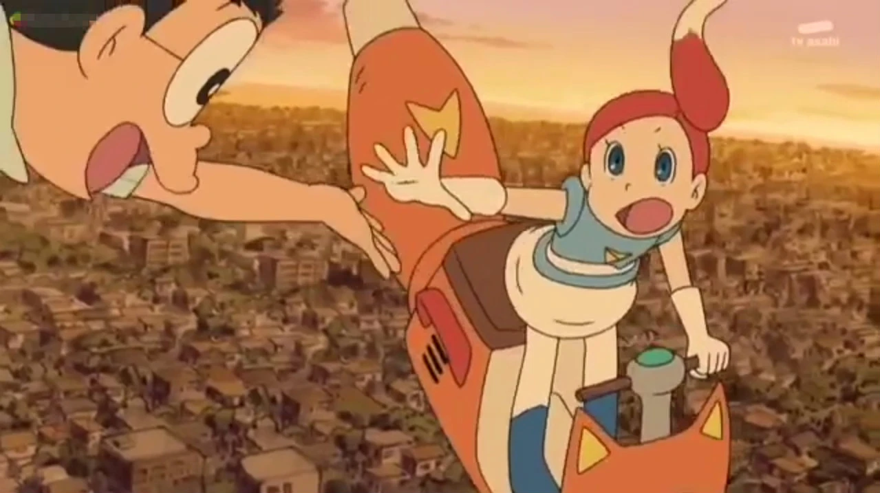 there is a high chance Doraemon break. Nobita stops Nina and told her not to harm him. Later, Nina saved Nobita from falling. Then the commander told Nina that they are launching a freezing missile but Nina asks for another chance to catch Mong to refrain Doraemon from breakage. Nobita made a little request to Dorami to get Perman from the TV with the use of TV Birdlime which made Nina extremely happy. Three of them successfully caught Mong.