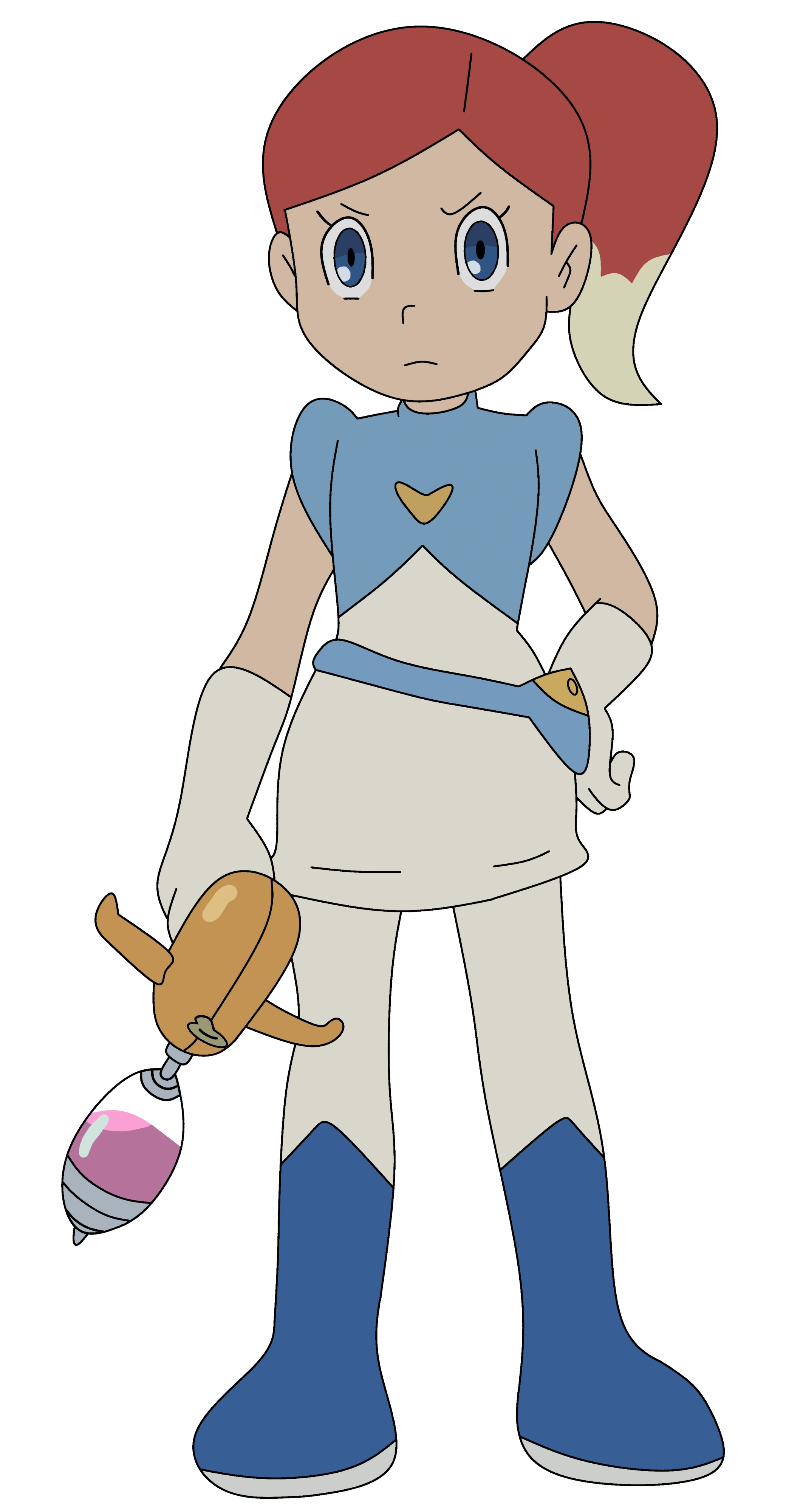 Nina has shoulder length Moderate amaranth hair with Light amberish gray tips and cobalt blue eyes her hair is held in a ponytail on the right side of her head,her hair colour makes it resemble a fox's tail and she wears a white dress with a blue bust and a golden v shaped logo on it with white elbow length gloves along with a blue and gold side pouch and white stockings paired with cobalt boots with grey soles