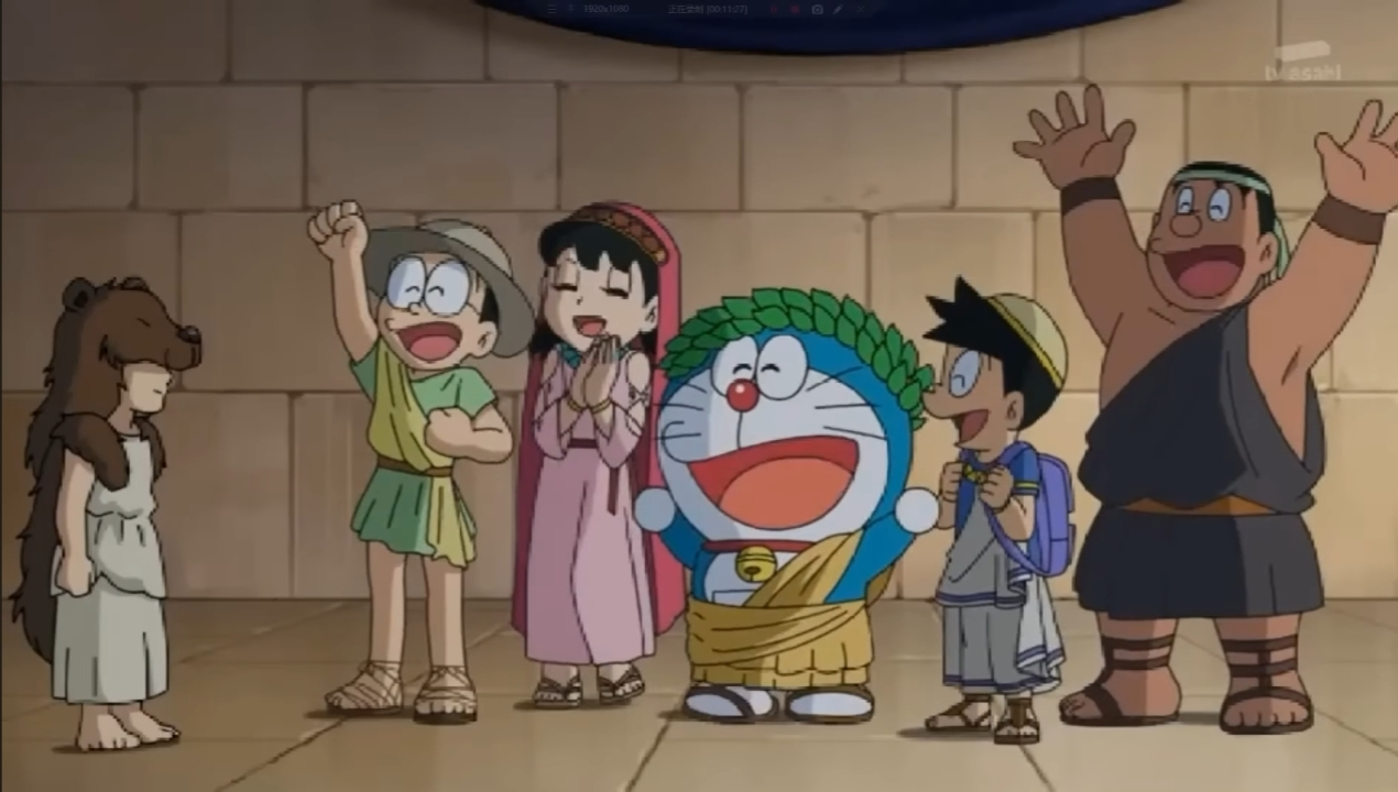 After the gangs were satisfied exploring ancient Greece. They return to the present and start Doraemon's party with a legend crescent-shaped birthday cake bought by his mother.