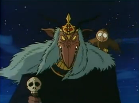 His face is similar to the appearance of the mix of a bird and a dinosaur. He has long yellow eyes and wears a crown on his head. His crown is small enough so that his ears don't get hurt by it. He also has long white hair and is seen wearing a black robe and holding a wand with a skull on top of it.