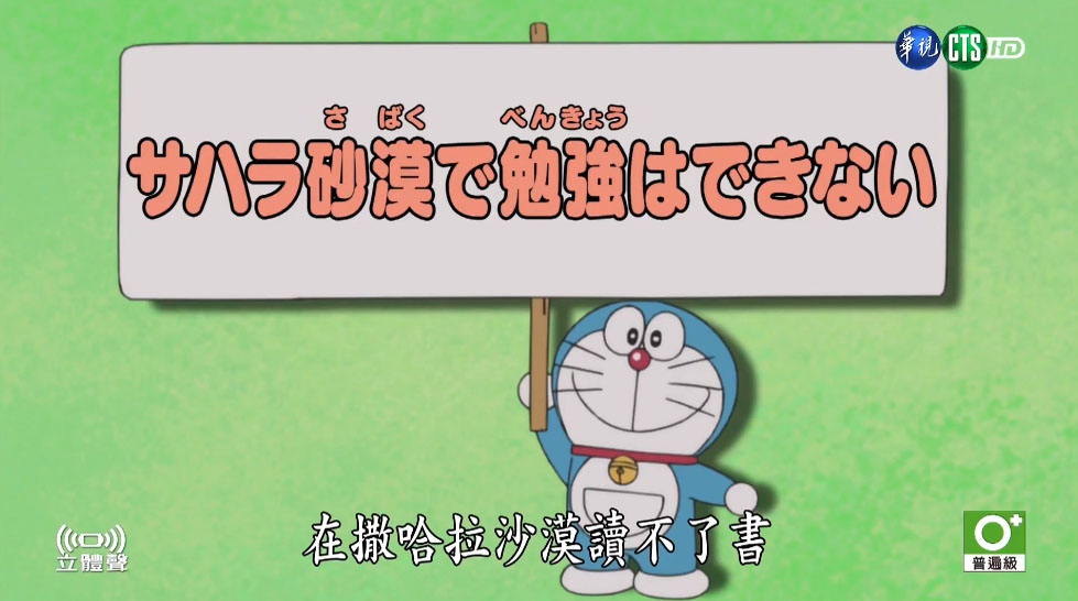 大雄用道具窥视静香(吃冰棒)和胖虎(躺著)偷懒,使哆啦A梦很生气。没想到,大雄按来按去却变出撒哈拉沙漠的风光。
