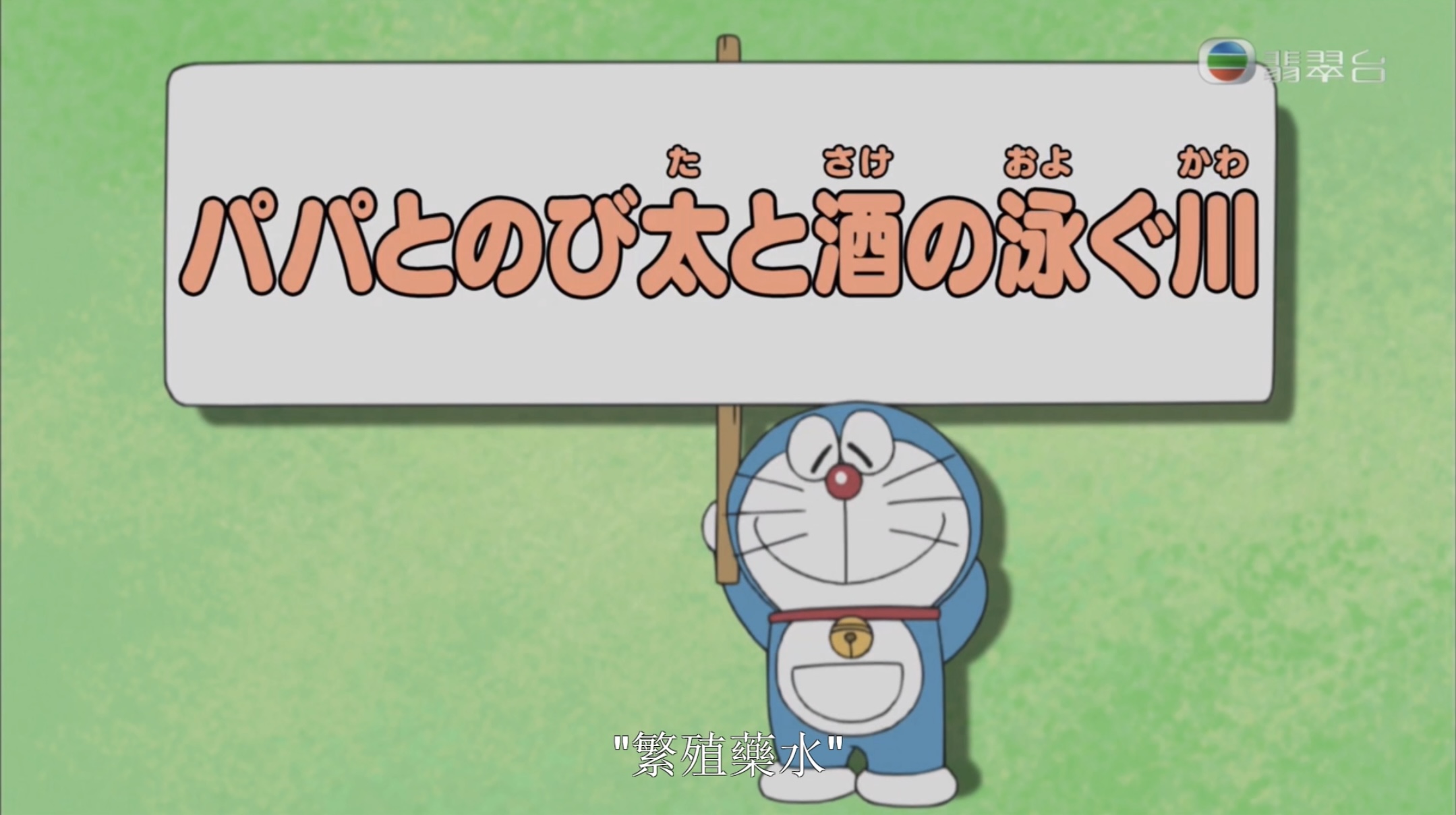 水田版動畫於2012年11月23日播出,哆啦A夢新番第314期總517集,更名為爸爸,大雄與游著酒的河(日語:パパとのび太と酒の泳ぐ川 )。重置版本2023年10月28日播出。