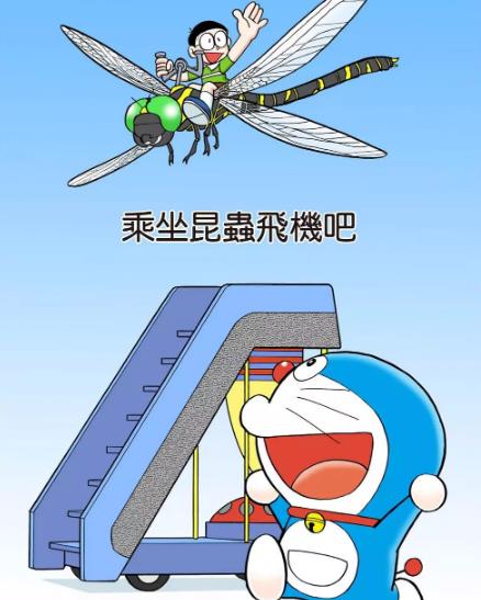 哆啦A梦拿出道具,只要把按钮按下去,就可以把任何昆虫变成飞机。