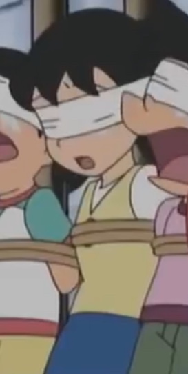 在《龍宮城裏的八天》中,即將被槍決的大雄、靜香及小夫四肢被捆綁在刑架上,眾人眼睛皆亦被白布條矇住,並絕望等待死亡到來。