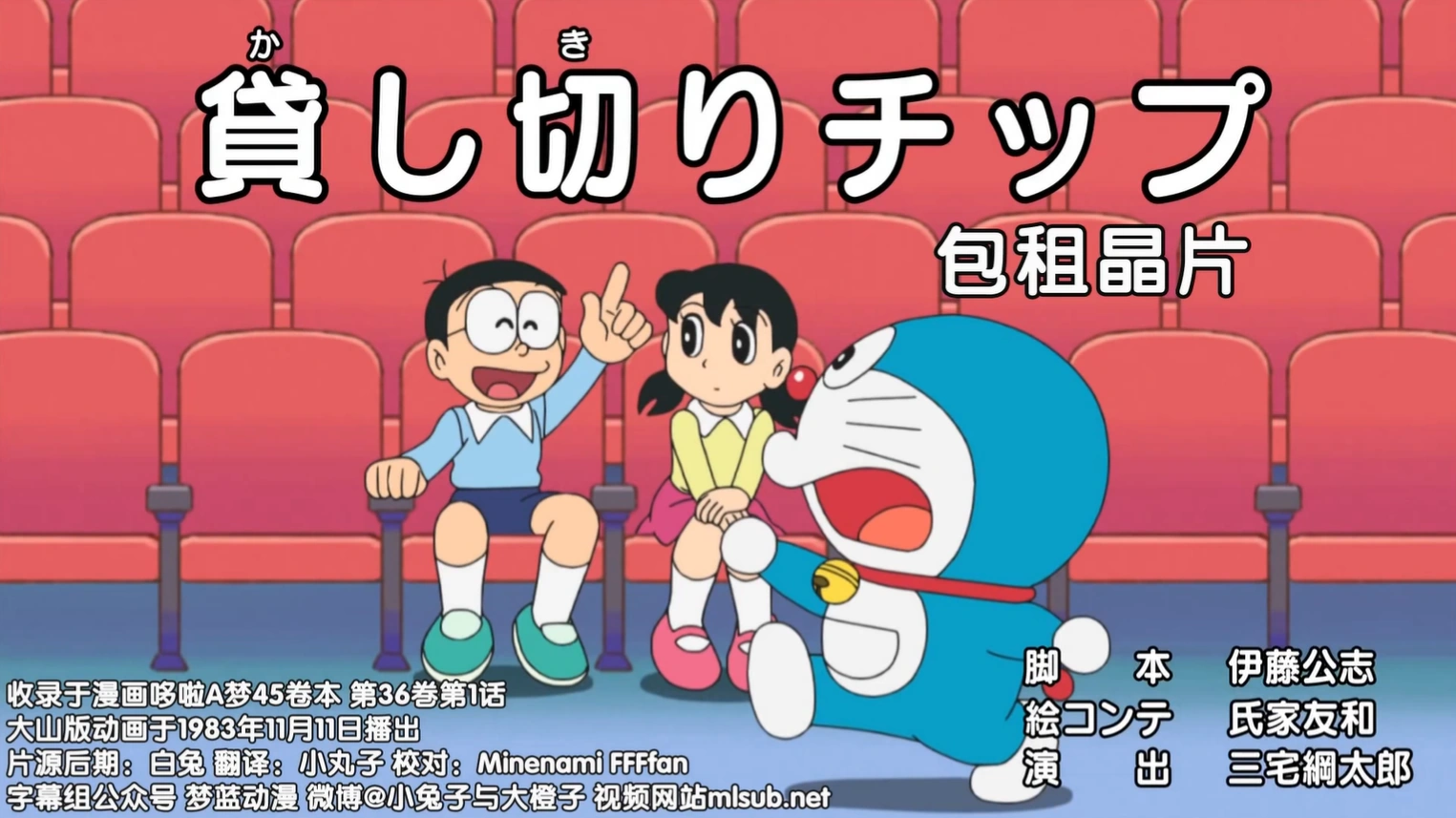 大雄和静香去电影院,对电影院丢“租借费”。最终电影院里面二人一起看电影。