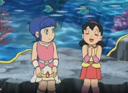 蘇菲婭是人魚族的公主,5000年前與族人離開原本居住的藍水星,改轉移到地球深海裡定居。後來潛入海中遊玩時因大雄和哆啦A夢利用道具,將全世界的街道都灌滿了虛擬海水,以便體驗潛水的樂趣,使她因沾染到虛構海水連帶氣體中才順勢游入小鎮中,甚至讓家中觀察星象的小杉看到蹤影。但在連帶氣體效果結束後,蘇菲婭掉落在大雄家院子裡的一棵樹上,直到隔天早上才被大雄發現。